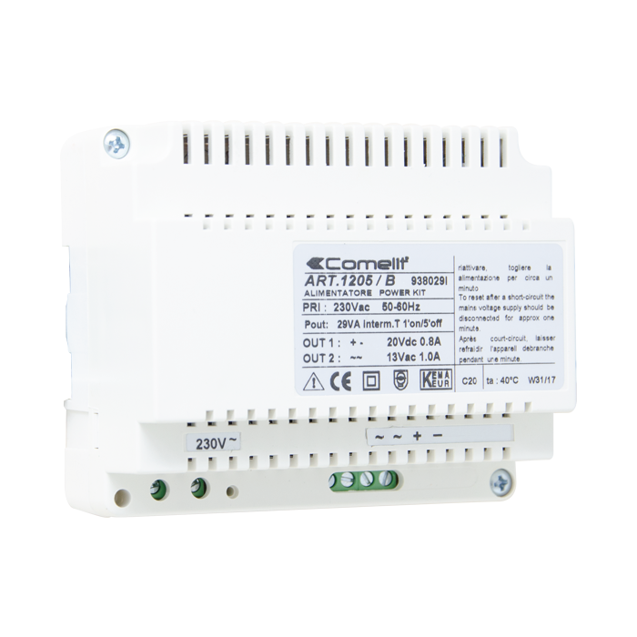 Technische Daten: Der Transformator verfügt über zwei Ausgänge: einen für die Versorgung der Türstation und des Elektroschlosses, den anderen für die Versorgung des Monitors. Abmessungen: 105 x 85 x 85 mm. Sicherung träge 500 mA. Klemmenleiste: Eingang AC 230 V, Ausgang AC für Türstation und Elektroschloss, Ausgang DC 20 V für die Versorgung des Monitors.