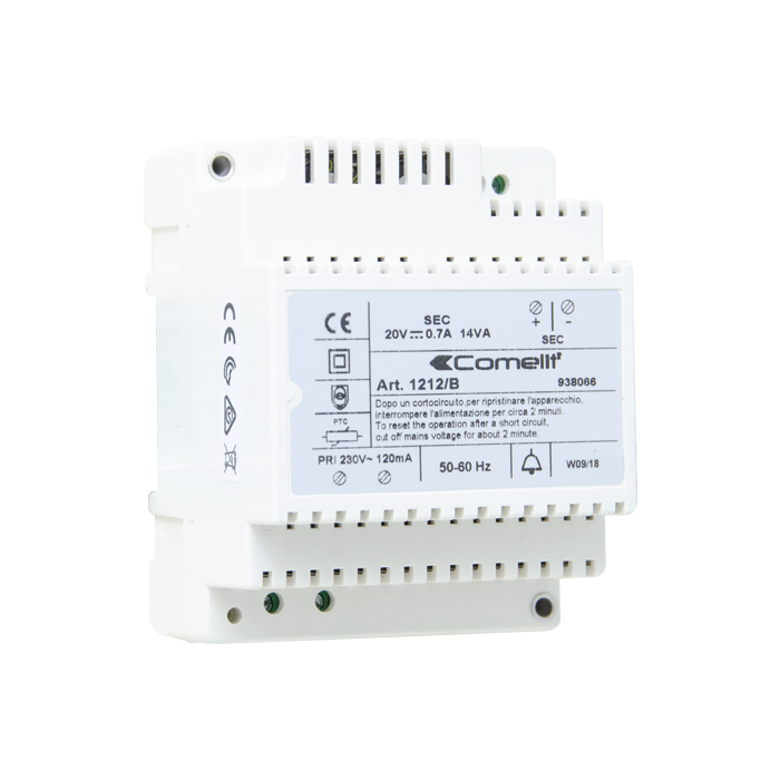 Netzgerät mit 230 VAC/50÷60Hz Eingang, 20V DC / 14VA Ausgang für zusätzliche Monitore. Das Netzgerät ist mit einem internen PTC-Schutz ausgestattet. Abmessungen: 87,5x105x65mm (5 DIN-Module).
