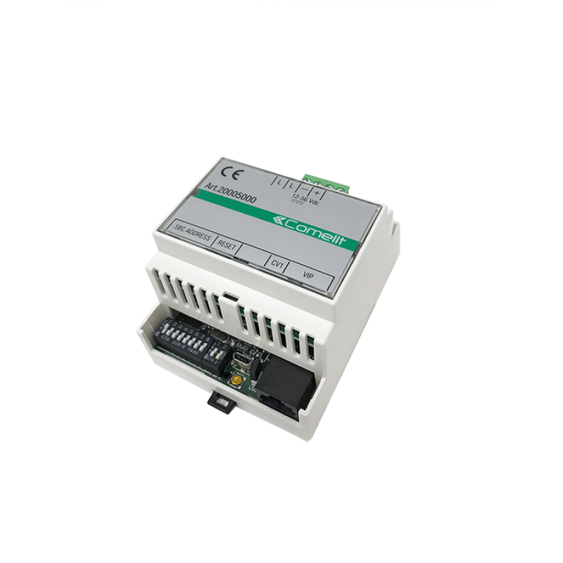 Gateway das die Verwendung von Monitoren und SmartHome Produkten des ViP-Systems in SB2 Audio-/Videosysteme ermöglicht. ViP Innensprechstellen und die Comelit App, sowie weitere Integrationsprodukte können verwendet werden, um Anrufe von der Türstation zu empfangen, Anrufe zu tätigen und Befehle an SB2 Geräte zu senden (Selbstaktivierung, Anruf an die Haupt- und / oder Sekundärschalttafel, Intercom-Anruf, Aktuatorsteuerung, Kameramodulsteuerung usw.). Das Gateway ermöglicht die Weiterleitung von Türrufen an die Comelit-App. Das Gateway verfügt über einen PoE-Ethernet-Anschluss für den Anschluss an die ViP-Geräte und den Anschluss an das SB2-System. Spannungsversorgung: 12-56 VDC. Abmessungen: 70x90x59 (4 DIN-Module).