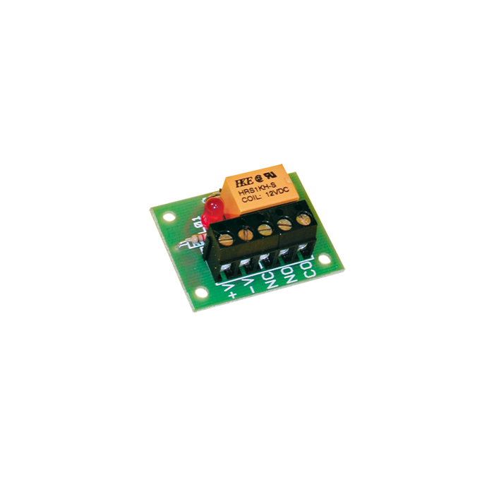 Karte mit 1 Relais, versorgt mit 12 V DC, Verbrauch 23 mA, separater Umschaltkontakt und NC/NO unabhängig wählbar, max. Kontaktleistung 3 A.