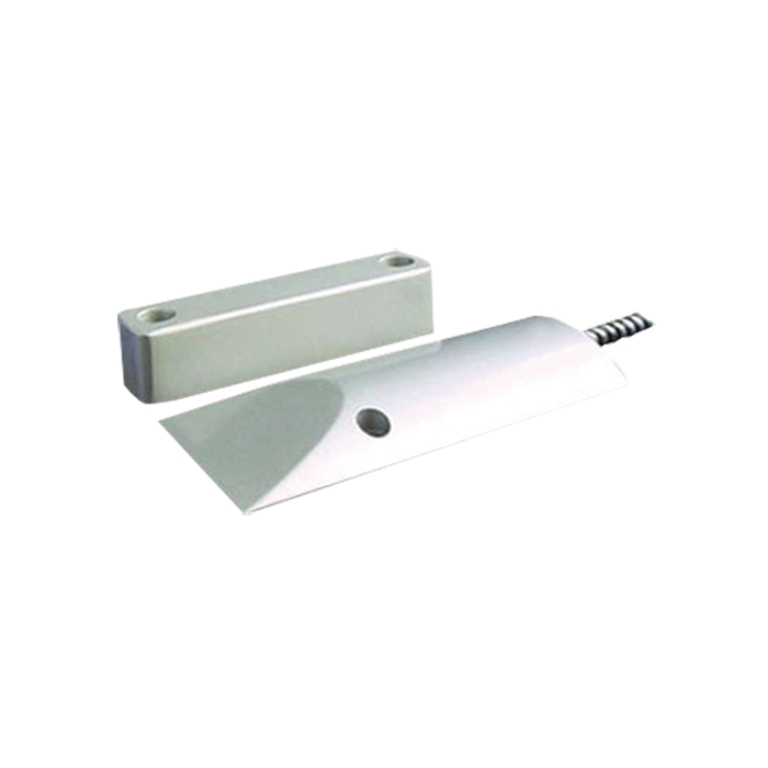 Magnetkontakt für Garagentore, Aluminiumgussgehäuse, mit durch Metallummantelung geschütztem Ausgangskabel. Abmessungen: (B x H x T) 62 x 105 x 20 mm.