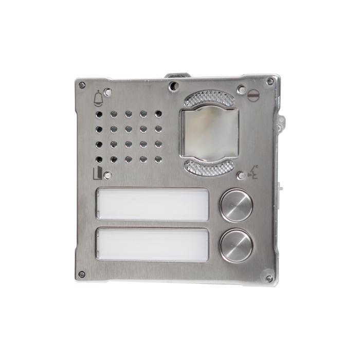 Lautsprecherabdeckung Vandalcom für iKall Video Module mit Edelstahl Front und zwei Tasten. Zu vervollständigen mit dem zugehörigen Lautsprecher-Modul, das abhängig vom verwendeten Verdrahtungssystems zu wählen ist. Abmessungen: 106x106x5,6mm.
