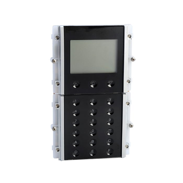 Digitales Rufmodul mit grafischem LCD-Display (128 x 64 Pixel) und Tastatur mit 21 beleuchteten Tasten (blaue LED). Kann auch als Codeschloss verwendet werden. Zur Namenssuche scrollen Sie mit zwei Suchtasten durch das Register oder geben den Anfangsbuchstaben des Namens ein. Sobald der richtige Name im Display erscheint, drücken Sie einfach die Klingeltaste. Der Ruf kann auch durch direkte Eingabe der Hausnummer ausgelöst werden. Die Begrüßungsansage ist konfigurierbar, die Displaytexte können auf Wunsch zweisprachig angezeigt werden. Kombinierbar mit elektronischen SimpleKey-Tags zur automatischen Aktualisierung der Namen im Namensregister. Für das SBC-System (Werkseinstellung) kann das digitale Namensregister bis zu 3.500 Benutzernamen und 6.000 Passwörter für die Codeschlossfunktion speichern. Benutzer und Einstellungen lassen sich einfach mit der PC-Software Art. 1249B (im Lieferumfang enthalten, mit USB-Kabel) über USB-Anschluss, RS485 oder lokal am Digitalmodul programmieren. Inklusive CD-ROM mit Upload-Software (Art. 1249B) für die PC-Installation und USB-Kabel. Abmessungen: 112 x 180 x 40 mm.