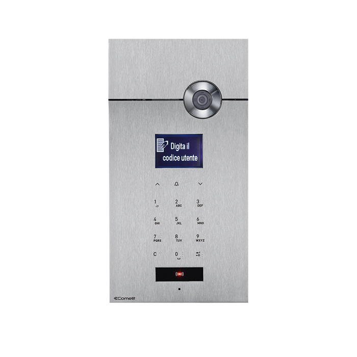 Unterputz-Türstation aus 3 mm starkem Edelstahl AISI 316. IK08-zertifiziert. Ausgestattet mit einem 128 x 64 Pixel großen Grafikdisplay mit Hintergrundbeleuchtung. Alphanumerische Tastatur mit exklusiver ?Sense?-Technologie: Die Metalloberfläche ist berührungsempfindlich. Alphanumerische Tastatur mit Braille-Schrift. Kann auch als Codeschloss verwendet werden. Um einen Namen zu suchen, scrollen Sie mit zwei Suchtasten durch das Register oder geben Sie den ersten Buchstaben des Namens ein. Sobald der richtige Name auf dem Display erscheint, drücken Sie einfach die Klingeltaste. Der Anruf kann auch durch direkte Eingabe der Hausnummer des Bewohners getätigt werden. Die Begrüßungsansage ist einstellbar, und die Displaytexte können auf Wunsch zweisprachig angezeigt werden. Ausgestattet mit einem RFID-Lesegerät zur lokalen Türschlosssteuerung und einem zusätzlichen Relais für verschiedene Anwendungen. Kombinierbar mit elektronischen SimpleKey-Tags zur automatischen Aktualisierung der Namen im Namensregister. Bis zu 4000 Benutzernamen, 4000 Passwörter für die Codeschlossfunktion und 4000 RFID-Schlüssel können gespeichert werden. Benutzer und Einstellungen können einfach mit der PC-Software Art. 1249B (im Lieferumfang enthalten, mit USB-Kabel) über den USB-Anschluss, RS485, lokal am Digitalmodul selbst oder dank des integrierten Webservers per Fernzugriff über den Ethernet-Anschluss programmiert werden. Kompatibel mit allen Simplebus 1-Funktionen und -Produkten. Komplett mit SBC