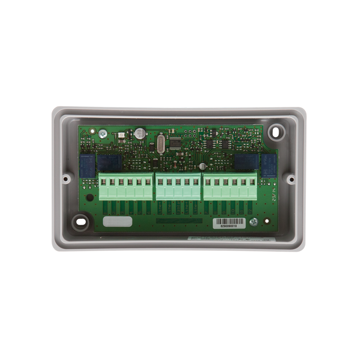 Das adressierte Modul 41IOM004XL mit integriertem Isolator steuert vier Relaisausgänge. Es wird über die Schleife mit Strom versorgt und über das Kommunikationsprotokoll von der Zentrale gesteuert. Dieses Modul wird in einem Aufputz-Kunststoffgehäuse mit größeren Abmessungen geliefert, um die Verdrahtung der Eingangs- und Ausgangskabel zu erleichtern. Gehäuseabmessungen (mm): 178 x 128 x 58. Schutzart: IP55. Zertifiziert nach EN 54-17 und EN 54-18.