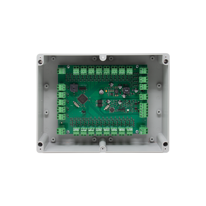 Adressierbares Modul mit 32 Open-Collector-Ausgängen. Entwickelt für den Aufbau von Übersichtstafeln. Das Modul wird in einer Schleife installiert und extern mit Strom versorgt. Enthält Ausgänge zur Signalisierung des Zustands der Tafel (Feueralarm, Störung, Ausschlüsse) und Eingänge für Funktionen wie Sirenen- und Summer-Stummschaltung, Reset, Test und Steuerungssperre. Untergebracht in einem grauen Kunststoffgehäuse mit den Abmessungen LxHxT (225x174x80). Zertifiziert nach EN 54-17 und EN 54-18.