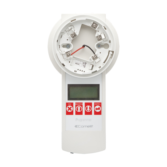 Das Programmiergerät 41SPG000 dient zum Zuweisen von Adressen an alle an die Schleife angeschlossenen Geräte (Melder, Module, Handfeuermelder, akustische und optische Alarme). Es ermöglicht das Lesen und Schreiben von Adressen sowie das Einstellen der Parameter von Meldern und Modulen. Es wird mit einem Netzteil (230 V AC, 50 Hz/1,5?12 V DC, 500 mA, 6 VA (max.)) und zwei Kabeln zum Anschluss der Module und Handfeuermelder geliefert. Alternativ kann es mit vier 1,5-V-AA-Batterien betrieben werden. Die Melder sowie die akustischen und optischen Alarme können direkt auf der Basis oben am Programmiergerät montiert werden. Abmessungen: 255 x 102 x 65 mm. Gewicht: 260 g.