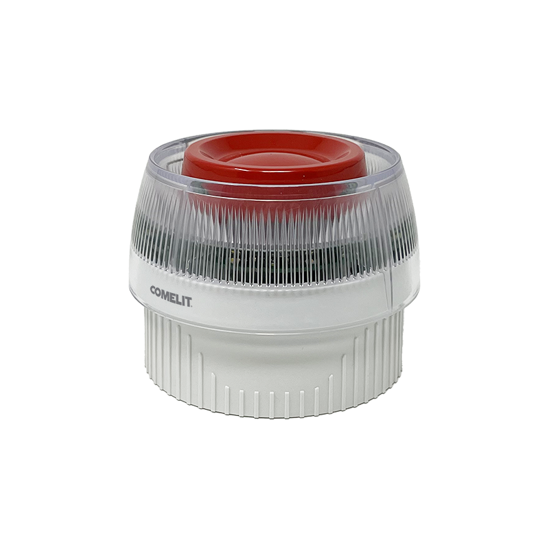 Adressierbare Funksirene mit Blinklicht, konzipiert für den Einsatz mit Comelit Funk-Erweiterungsmodulen. Ausgestattet mit 360° sichtbaren Anzeige-LEDs und einem integrierten akustischen Melder zur Signalisierung von Feueralarmen und zur Lokalisierung innerhalb des Systems. Um unbefugte Demontage oder Entfernung zu verhindern, kann sie am Sockel verriegelt werden. Ausgestattet mit einem Sabotageschutz zur Signalisierung beim Öffnen. Die 45SCI100 verfügt über 4 Lautstärken und 32 verschiedene Töne. Maximale Schallleistung 92 dB(A) ±5 dB bei 1 m (hoher Hauptton 27). Die Geräteregistrierung (Enrollment) ist schnell und einfach. Kommunikationsdistanz zwischen Melder und Erweiterung (im freien Feld) über 1000 Meter. Bidirektionale Funkkommunikation mit proprietärem Kommunikationsprotokoll. Batterien (4 x CR123A) mit einer maximalen Lebensdauer von ca. 8 Jahren (je nach Nutzung und Einstellungen). Temperaturbereich -10 °C / +55 °C. Abmessungen (inkl. Sockel): Ø116 x 90 mm. Material: SAN. Schutzklasse: IP31. Zertifiziert nach EN 54-3, EN 54-23 und EN 54-25.