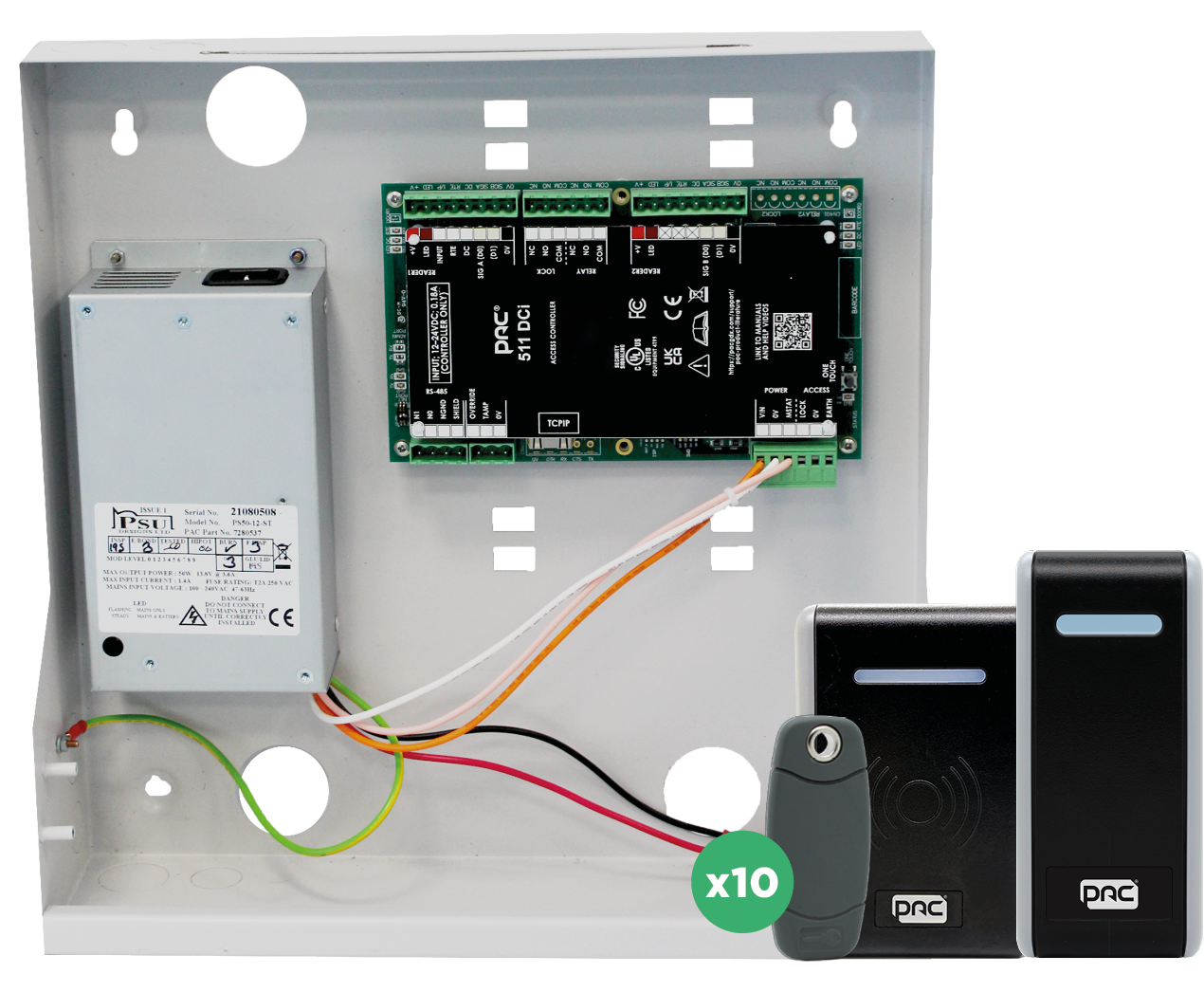 Komplettes Zutrittskontrollsystem, maßgeschneidert für den Einstieg in ein Zutrittsmanagementsystem. Dieses Kit ist für die Verwaltung einer Tür mit 10 Schlüsseln ausgelegt. Das Kit enthält außerdem einen Kartenleser zum Einlesen der Karten in die Software. ? Steuereinheit für eine einzelne Tür, die über TCP/IP und RS-485 kommunizieren kann ? Robustes Metallgehäuse mit Manipulationsschutz ? 12VDC-Netzteil mit einer Kapazität von 3A ? Relais zur Steuerung von Schlössern/Magnetspulen, einschließlich eines Hilfsrelais für zusätzliche Schaltungen ? RFID-Lesegerätanschluss für 1 oder 2 Kartenleser ? RTE-Türöffner-Tastenanschluss für einfachen Zutritt ? Türstatuskontakt für Echtzeitüberwachung ? One-Touch-Testfunktion für schnelle und einfache Installation. Das Kit enthält: ? 1 PAC 511 DCi mit Gehäuse und Netzteil 909030511 ? 1 Rahmenkartenleser 909020120 ?1 Administrationsleser 909020115 ?10 Tags 909021106 ?1 Lizenz ACCESS CENTRAL? Software