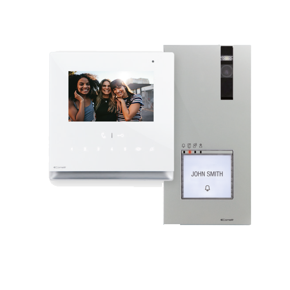 Einfamilienhauskit Quadra mit Icona, SB2 Video Kit. Dieses Kit ist im Auslieferungszustand komplett auf Adresse 1 voradressiert und muss lediglich installiert und elektrisch angeschlossen werden. Zusätzlich besteht die Möglichkeit die Klingeltaste via DIP Schaltercode zu teilen oder zu vierteln und dieses Kit durch Erweiterung weiterer Innenstationen, Audio oder Video, in ein Zweifamilienhaus oder Vierfamilinehaus Kit umzuwandeln. Es können maximal 4 Innenstationen Audio oder Video pro Teilnehmer installiert werden. Dieses Kit besteht aus: 1x Türstation Quadra Art. 4893M zur Aufputzmontage, 1x Netzteil Art. 1209, 1x Icona Innenstation Art. 6601W mit Aufputzgehäuse Art. 6620 und Unterputzgehäuse 6617, Abzweigklemme Art. 1214/2C und Abschlusswiderstand Art. 1216. Mit dem optionalen Zubehörartikel 4792E kann die horizontale Neigung der Türstation Quadra um 25° verändert werden.
