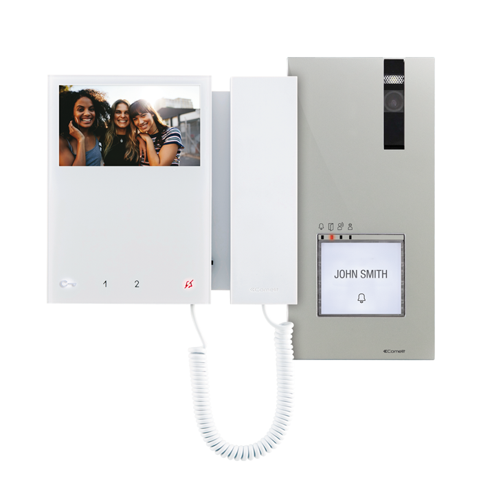 Einfamilienhauskit Quadra mit Mini hörergebunden, SB2 Video Kit. Dieses Kit ist im Auslieferungszustand komplett auf Adresse 1 voradressiert und muss lediglich installiert und elektrisch angeschlossen werden. Zusätzlich besteht die Möglichkeit die Klingeltaste via DIP Schaltercode zu teilen oder zu vierteln und dieses Kit durch Erweiterung weiterer Innenstationen, Audio oder Video, in ein Zweifamilienhaus oder Vierfamilinehaus Kit umzuwandeln. Es können maximal 4 Innenstationen Audio oder Video pro Teilnehmer installiert werden. Dieses Kit besteht aus: 1x Türstation Quadra Art. 4893M zur Aufputzmontage, 1x Netzteil Art. 1209, 1x Mini Innenstation Art. 6701W, Abzweigklemme Art. 1214/2C und Abschlusswiderstand Art. 1216. Mit dem optionalen Zubehörartikel 4792E kann die horizontale Neigung der Türstation Quadra um 25° verändert werden.