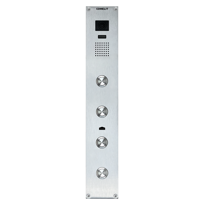 Adam Monoblock-Unterputz-Audio-/Video-Türsprechstelle mit 4 Tastern. Digitales 2-Draht-Simplebus 2-System. Die Frontplatte besteht aus eloxiertem Aluminium, ist witterungsbeständig und vandalensicher (Schutzklasse IK08). Weitwinkelkamera. Die Tastern sind vorprogrammiert, um die Video-Türsprechanlagen mit den Rufcodes 1, 2, 3 und 4 anzurufen. Die Gesamtbreite beträgt nur 60 mm, eine sehr kompakte Größe, die neben der traditionellen Wandmontage auch die direkte Montage der Türsprechstelle am Türrahmen ermöglicht. Ideal auch für Renovierungen. Namensschilder Art. AD9201 und individuell gestaltbare Hinweisschilder Art. AD9202 können ergänzt werden. Abmessungen (B x H x T): 60 x 345 x 37 mm.