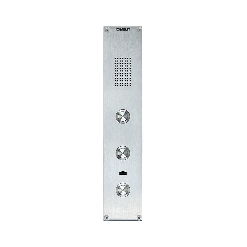 Adam Monoblock-Unterputz-Audio-Türstation mit 3 Tastern. Traditionelle 5-Draht-Technik. Die Frontplatte besteht aus eloxiertem Aluminium, ist wetterfest und vandalensicher (Schutzklasse IK08). Die Gesamtbreite beträgt nur 60 mm, eine sehr kompakte Größe, die neben der traditionellen Wandmontage auch die direkte Montage am Türrahmen ermöglicht. Ideal auch für Renovierungen. Namensschilder Art. AD9201 und individuell gestaltbare Hinweisschilder Art. AD9202 können ergänzt werden. Abmessungen (B x H x T): 60 x 300 x 37 mm.