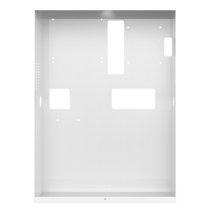 Weißes Metall-Aufputzgehäuse für VEDO-Bedienfeldkarten, Artikelnr. PCBVEDO10NL, PCBVEDO34NL und PCBVEDO68NL. Geeignet für 7 Ah oder 18 Ah Akkus, Netzteile Artikelnr. PSU15 oder PSU50, zwei Erweiterungskarten am Bus und Manipulationsschutz gegen Ziehen und Öffnen. Abmessungen (B x H x T): 315 x 440 x 100 mm. Zertifiziert nach EN50131 Grad 2.