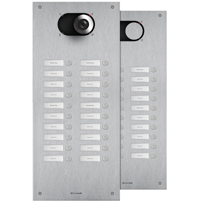 Frontplatte Serie Switch, 20 Teilnehmer, 2-reihig, SB2, VIP. Zu vervollständigen mit dem UP- Gehäuse IX9154 oder AP-Gehäuse IX9164 sowie mit dem Lautsprecher Audio oder Video (Systemabhängig) Art. 1621, 1621VC, 1682, 4680C, 4681 oder 4682HD. Frontplatte aus 2,5mm starker Edelstahlplatte V4A und zwanzig flächenbündig integrierten Klingeltasten. Namensschilder von vorne zu wechseln, inkl. rückseitiger LED-Beleuchtung. Integriertes Ausstattungsmerkmal ist die Handicap-Funktion nach DIN 18040 mit Zustandsanzeige Türruf, Gesprächsbereit, Türöffnerfunktion und Teilnehmererreichbarkeit visuell mit LED´s hinter genormten Handicap Symbolen sowie akustischer Sprachausgabe der Zustände. Zu verwenden mit Netzgerät Art. 1210. Schlagfestigkeit: IK08. Abmessungen: 502,1x216,4x2,5mm.