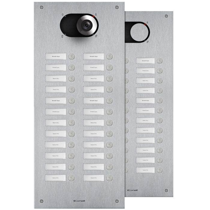 Frontplatte Serie Switch, 24 Teilnehmer, 2-reihig, SB2, VIP. Zu vervollständigen mit dem UP- Gehäuse IX9154 oder AP-Gehäuse IX9164 sowie mit dem Lautsprecher Audio oder Video (Systemabhängig) Art. 1621, 1621VC, 1682, 4680C, 4681 oder 4682HD. Frontplatte aus 2,5mm starker Edelstahlplatte V4A und vierundzwanzig flächenbündig integrierten Klingeltasten. Namensschilder von vorne zu wechseln, inkl. rückseitiger LED-Beleuchtung. Integriertes Ausstattungsmerkmal ist die Handicap-Funktion nach DIN 18040 mit Zustandsanzeige Türruf, Gesprächsbereit, Türöffnerfunktion und Teilnehmererreichbarkeit visuell mit LED´s hinter genormten Handicap Symbolen sowie akustischer Sprachausgabe der Zustände. Zu verwenden mit Netzgerät Art. 1210. Schlagfestigkeit: IK08. Abmessungen: 502,1x216,4x2,5mm.