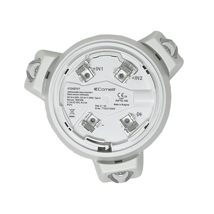 Kit bestehend aus einem flachen Sockel mit optischer Signalisierung, zertifiziert nach EN54-23 (41VAD100) und einem akustischen Signalgerät, zertifiziert nach EN54-3 (41SAB101), für Innen- und Deckenmontage. Mit den gleichen Eigenschaften wie der Sockel 41RBX020 verfügt der Sockel 41VAD100 über 3 gleichmäßig angeordnete weiße Blinklichter für 360°-Sichtbarkeit. Maximale Stromaufnahme mit Blinklicht und hoher Lautstärke <29 mA. Gesamtdurchmesser: 160 mm. Farbe: weiß RAL 9016. ABS-Kunststoff. Zertifiziert nach EN54-3 und EN54-23.