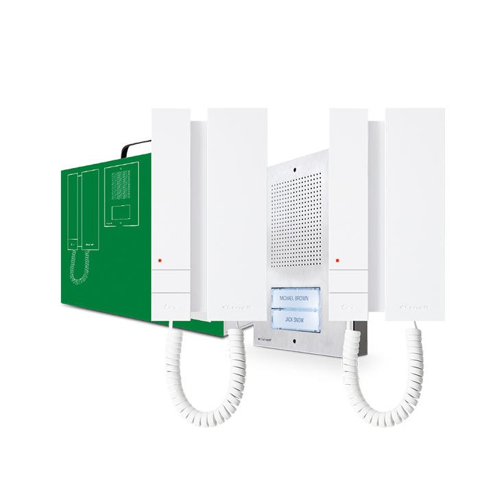 Das Set enthält: zwei Mini-Türsprechanlagen (Art. 2702W), einen Transformator (Art. 1200) und eine Türstation mit zwei Tastern (Extra Series Art. ET5002). Das Set kann mit einer zusätzlichen Türsprechanlage pro Benutzer erweitert werden. Die Türstation kann mit dem im Set enthaltenen Zubehör auf- oder unterputz montiert werden.