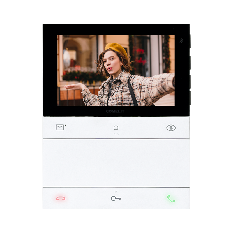 Videosprechstelle der Logos-Serie zur Aufputzmontage mit Freisprechfunktion und 5? Farbdisplay. Simplebus 2-System. Sie ist mit beleuchteten Tasten für die Sprechverbindung und das Gesprächsende, sowie mit 4 programmierbaren mechanischen Tasten ausgestattet, die bereits so konfiguriert sind, dass sie die vom Benutzer am häufigsten verwendeten Aktionen aktivieren: Elektroschloss, Memovideo, Relaissteuerung, automatische Einschaltung. An der Seite der Videosprechstelle befinden sich Tasten zur Aktivierung der Stummschaltung mit entsprechender grafischer und visueller Anzeige, sowie Tasten für den Zugang zum Menü und zur Navigation. Über das Menü lassen sich unter anderem die Werte für Helligkeit, Kontrast, Farbe und Ruftonlautstärke einstellen. Es besteht die Möglichkeit, zwischen verschiedenen Melodien für den Klingelton zu wählen. Die mittleren Tasten in jeder Reihe sind mit taktilen Führungen für Sehbehinderte ausgestattet. Ausstattung serienmäßig mit Etagenruf. Der Eingang für den Etagenruf kann auch so konfiguriert werden, dass er die Türöffnertaste oder ein Relais (allgemein oder mit Code) fernsteuert, bzw. einen Panikruf sendet. Die Videosprechstelle ist mit einer NFC-Verbindung ausgestattet, die eine vollständige Geräteprogrammierung über das Smartphone und die MyComelit-App ermöglicht, auch wenn die Videosprechstelle abgeschaltet ist. Zum Lieferumfang gehört die Metallhalterung, die eine feste und stabile Befestigung gewährleistet, sowie die Abzweigklemme von der Steigleitung Art. 1214/2C.