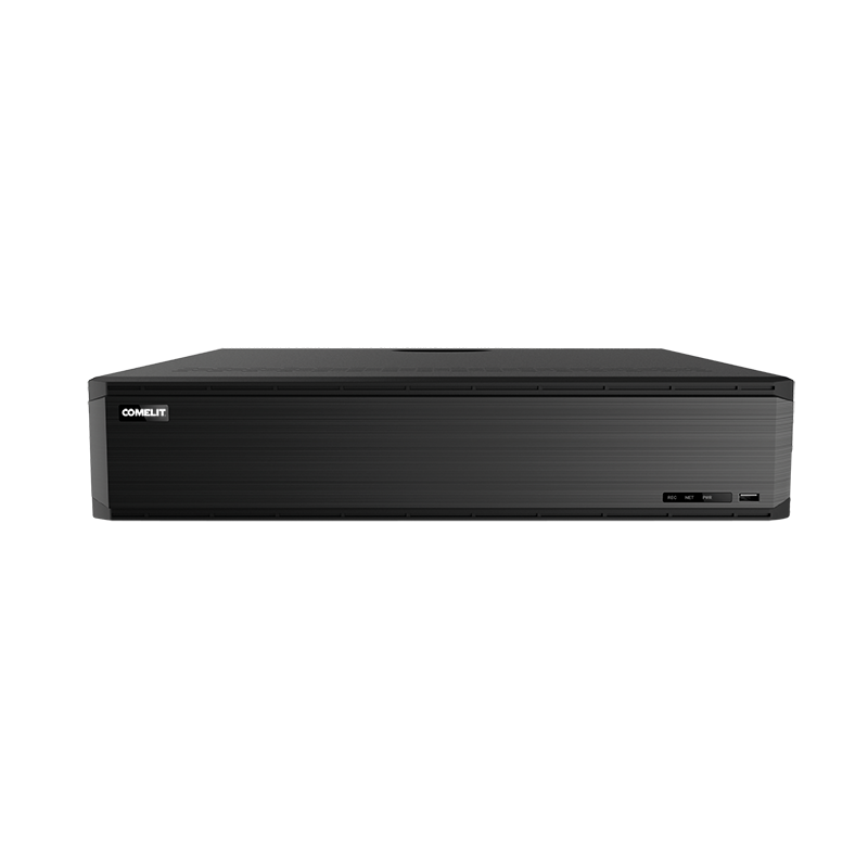 Netzwerk-Videorekorder (NVR) für 32 IP-Kanäle, NDAA konform. Max. Auflösung 12MP, H.265S/H.265+/H.265/H.264 Videokomprimierung, Dual Streaming, 320Mbps Bandbreite. Unterstützt alle DVA-Videoanalysefunktionen der angeschlossenen Kameras. Datenbank für Gesichter und Kennzeichen. Kompatible Browser: IE/Google Chrome/Edge/Firefox/Safari. Alarmein-/-ausgänge. Fernsteuerung über Comelit CCTV APP und Comelit CCTV Manager Software. Dieser NVR stellt eine Verbindung zu Comelit Servern her, die durch AWS-Dienste geschützt sind. Steuerung des Fisheye-Dewarping über die Webseite und die APP möglich.