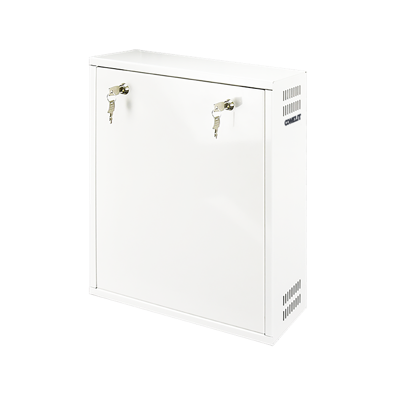 Metallgehäuse für NVR und XVR, ausgestattet mit einem Doppelschlüsselschloss und Manipulationsschutz an Tür und Wand. Maximale Rekorderabmessungen: 335 x 375 x 95 mm
