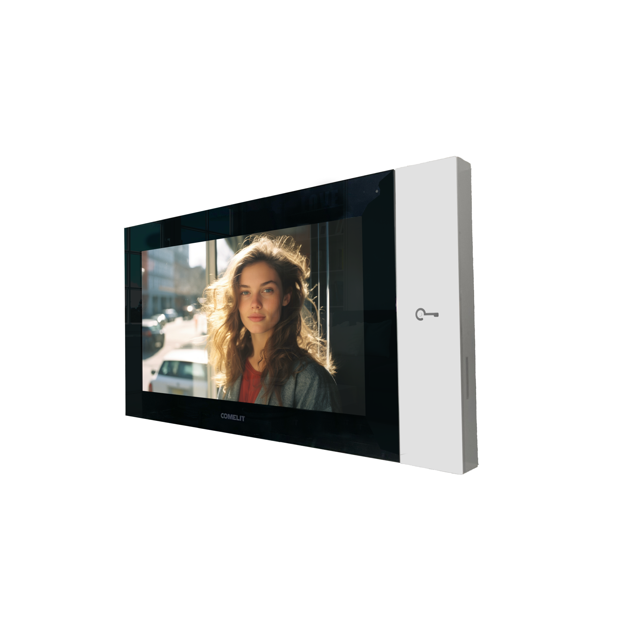 7TOP Video-Türsprechanlage für VIP-Systeme mit 7-Zoll-Farb-Touchscreen und mechanischer Türverriegelung mit beleuchtetem Symbol. Modernes und ansprechendes Design, das Robustheit und Benutzerfreundlichkeit vereint. Die Wandmontage erfolgt mit der mitgelieferten Metallplatte für eine stabile und sichere Befestigung oder auf einem speziellen Tischständer (separat erhältlich). Stromversorgung: Standard-POE, 1440-A-Netzteil oder ein dediziertes 48-V-Netzteil. An der Seite befindet sich ein MicroSD-Kartensteckplatz (nicht im Lieferumfang enthalten), über den Sie personalisierte Klingeltöne laden können. Die Anlage verfügt über lokal programmierbare Eingänge, einen programmierbaren Ausgang und einen Ausgang für eine zusätzliche Klingel. Ethernet- und WLAN-Konnektivität ermöglichen die Verbindung mit der Comelit Cloud und den Empfang von Anrufen über die Smartphone-App, auch von unterwegs. Das Betriebssystem ist Linux und bietet Freisprechfunktion.