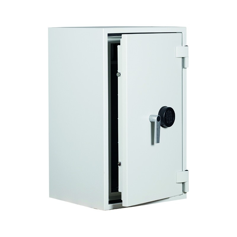Der DRS Combi-Fire 3E ist ein hochwertiger Tresor zur sicheren Aufbewahrung von Dokumenten und Wertsachen. Er bietet 60 Minuten Feuerschutz und ist einbruchsicher geprüft, um optimalen Schutz für Ihre Wertgegenstände zu gewährleisten. Modell 3E ist mit einem elektronischen Zahlenschloss und einem dreiseitigen Verriegelungssystem ausgestattet und verfügt über höhenverstellbare Einlegeböden für zusätzliche Flexibilität. Die Tür lässt sich um 180° öffnen, und der Tresor ist für die Bodenverankerung zur stabilen und sicheren Installation konzipiert. Erhältlich in RAL 7035 Grau.