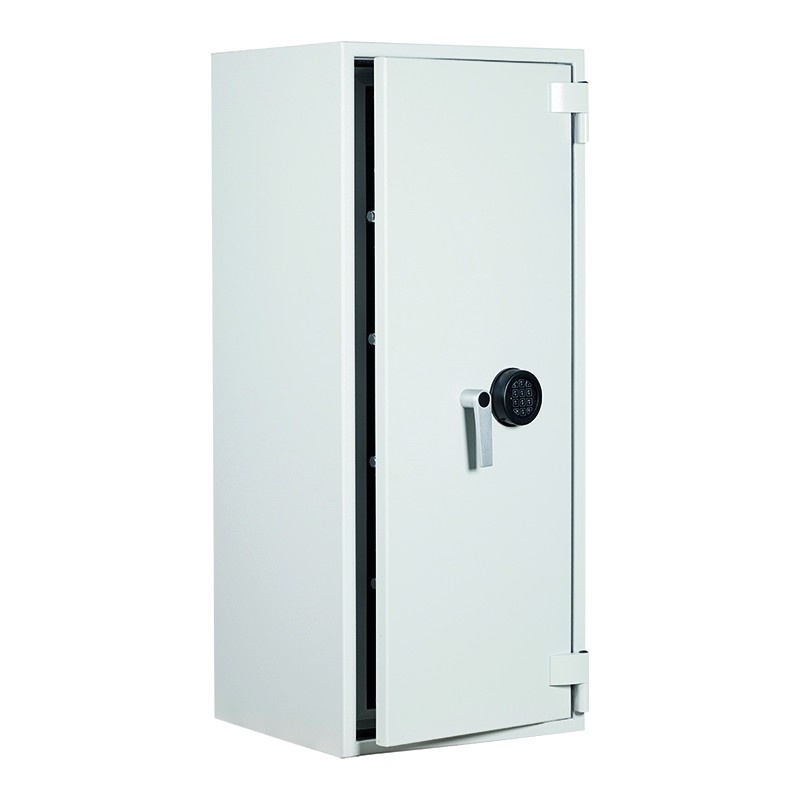 Der DRS Combi-Fire 4E ist ein besonders sicherer Tresor zum Schutz von Dokumenten und Wertsachen. Er bietet 60 Minuten Feuerschutz und wurde auf Einbruchsicherheit geprüft, um optimale Sicherheit für Ihre Wertgegenstände zu gewährleisten. Modell 4E verfügt über ein elektronisches Zahlenschloss und ein dreiseitiges Verriegelungssystem sowie höhenverstellbare Einlegeböden für maximale Flexibilität. Die Tür lässt sich um 180° öffnen, und der Tresor ist für die Bodenverankerung zur stabilen und sicheren Installation konzipiert. Erhältlich in RAL 7035 Grau.