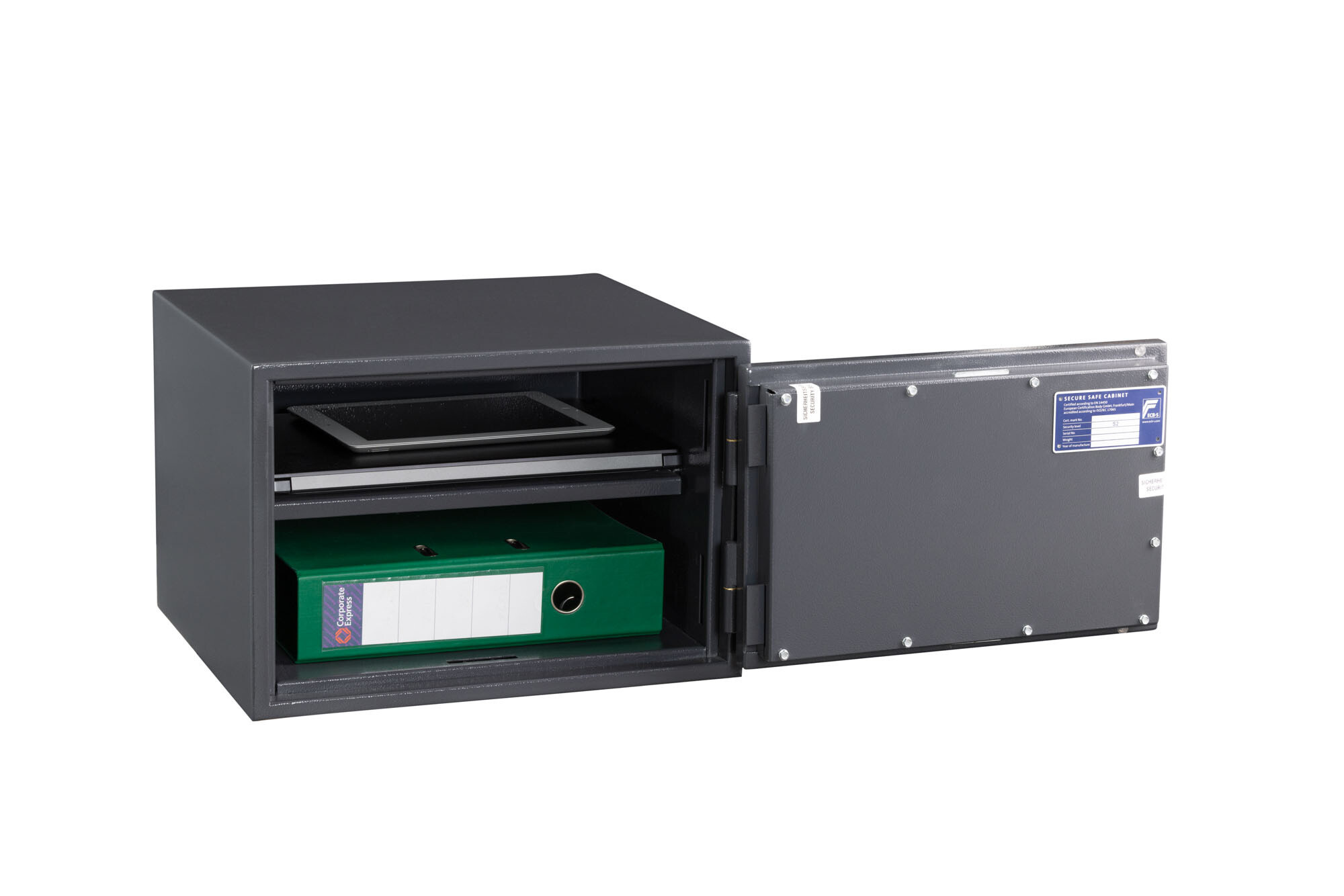 Der Safe verfügt über ein Regal, was eine effiziente Nutzung des Lagerraums ermöglicht.
