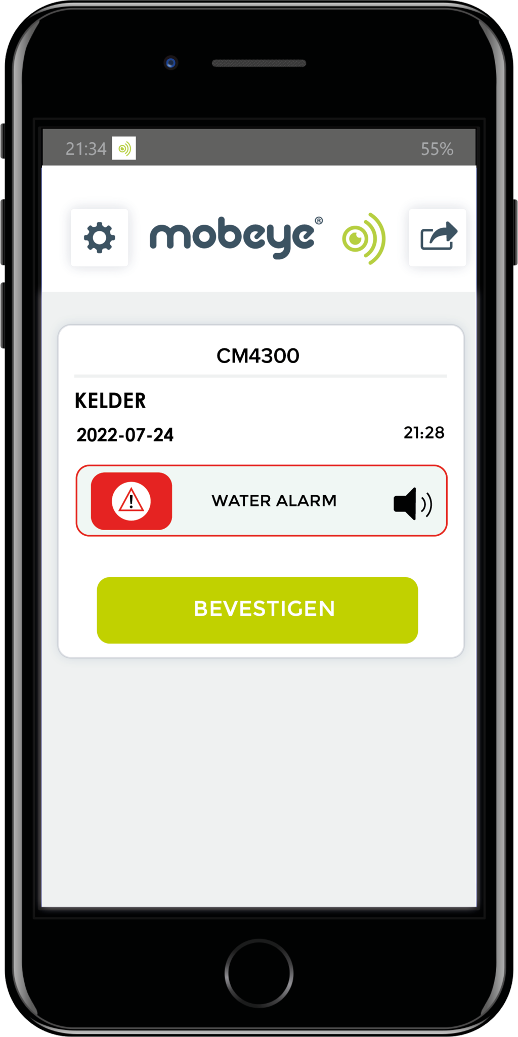 Sobald der Wassersensor oder einer der zusätzlichen Eingänge Alarm schlägt, erfolgt eine Push-Nachricht, ein Anruf, eine SMS und/oder eine E-Mail. Die Anzahl der Kontaktpersonen sowie die Wahl der Alarmart sind unbegrenzt. Der Mobeye WaterGuard funktioniert mit Batterien über ein Jahr lang. Bei niedriger Batteriespannung erfolgt eine Meldung. Bei Verwendung einer externen Stromquelle (12–24 V DC oder Netzstrom) werden auch Meldungen über einen Stromausfall gesendet. Dies ist oft das erste Signal, dass etwas nicht stimmt und Maßnahmen erforderlich sind.