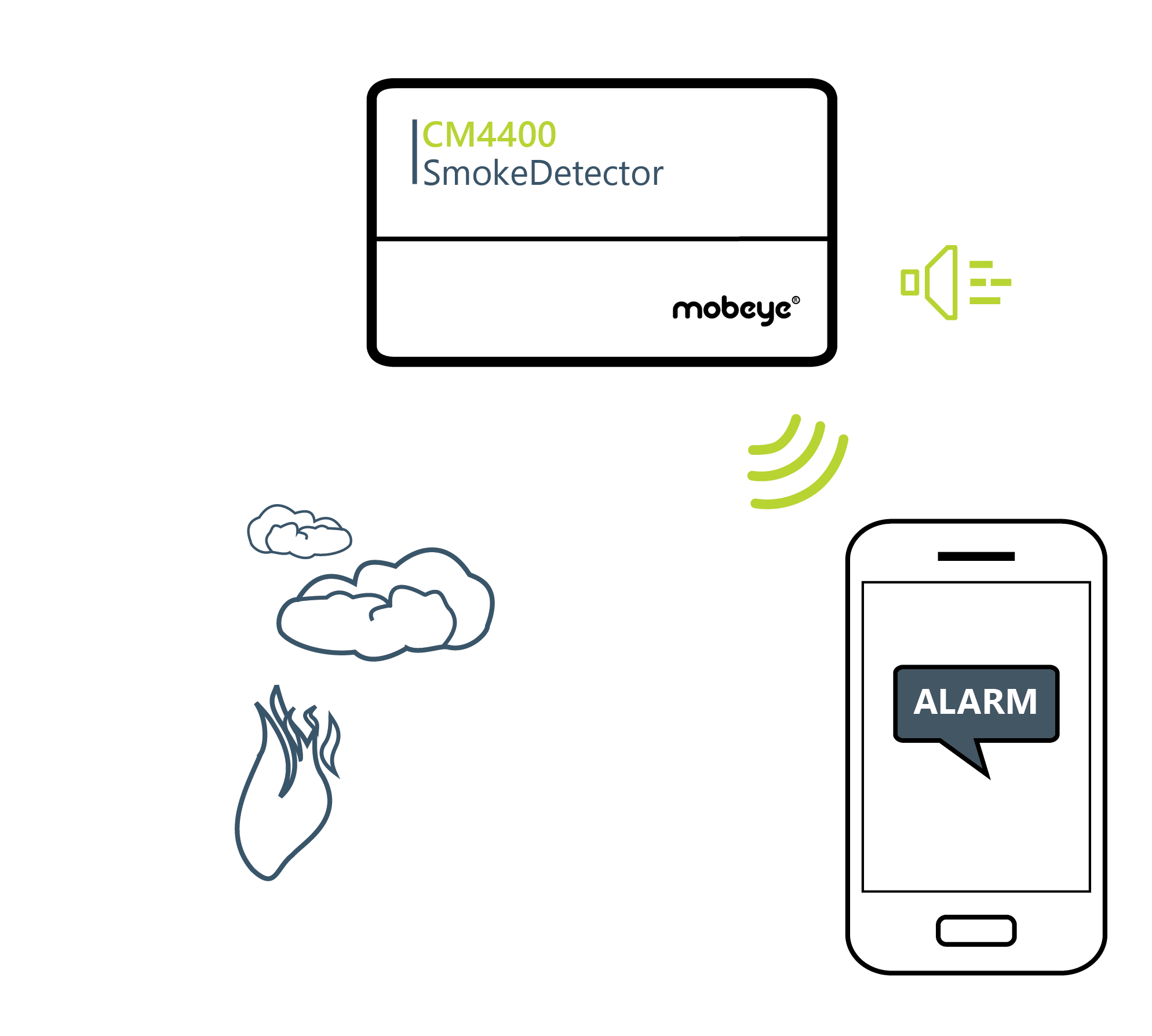 Das Mobeye CM4400 Brandmelde-Set ist ein zuverlässiger Rauchmelder mit Kommunikationsmodul zur Weiterleitung an Kontakte. Sobald Rauch erkannt wird, ertönt die Sirene und es wird umgehend eine Warnung per Push-Nachricht, Anruf, SMS und/oder E-Mail versendet.