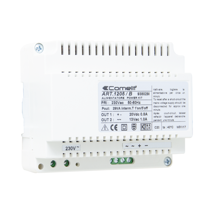 Technische gegevens: De transformator heeft twee uitgangen: een voor voeding van het deurstation en het elektrische slot en de andere voor voeding van de monitor. Afmetingen: 105x85x85 mm. Vertraagde zekering 500 mA. Aansluitblok:AC230V ingang netspanning ~~ AC- uitgang voor deurstation en elektrisch slot + - uitgang 20V DC voeding van de monitor.
