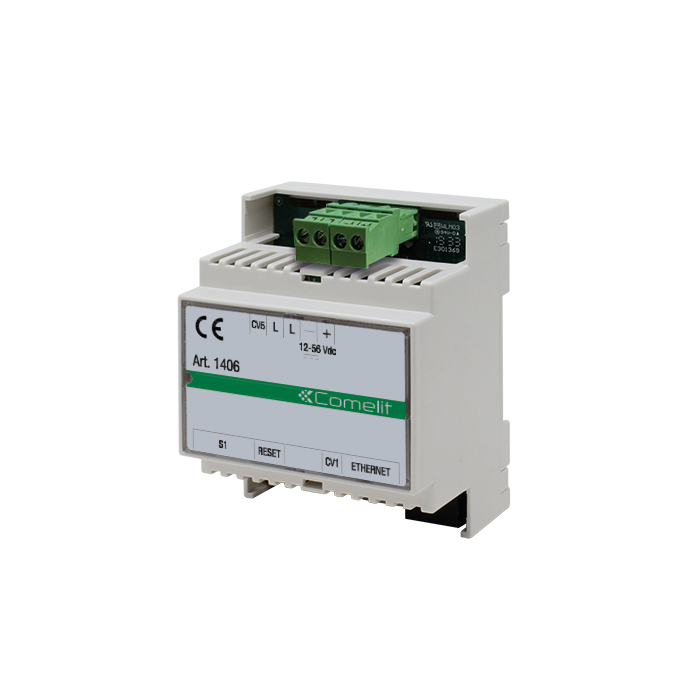 Multi-user doorschakelingsmodule voor Simplebus2 voor het verzenden van video-deurintercom oproepen op smartphones/tablets waarop de SimpleApp is geïnstalleerd. Het is ook mogelijk een beeldoproep van het deurstation uit te voeren en deurslotbedieningsopdrachten te versturen. Voor een goede werking van de module is een internetverbinding nodig met voldoende bandbreedte. De module ondersteunt maximaal 50 appartementen en 15 actieve gebruikers per appartement. Bij installaties met meer dan 50 appartementen kunnen meerdere modules worden geïnstalleerd. De ontvangst van de oproep op SimpleApp is alleen mogelijk als er een Comelit binnenpost in het appartement is geïnstalleerd.. De module is uitgerust met 1 ethernetpoort voor de internetverbinding, is voorzien van een voedingsingang 12-56 Vdc en klemmen L-L voor de communicatie met het systeem Simplebus 2. Afmetingen 70x90x62mm (4 DIN-modules).