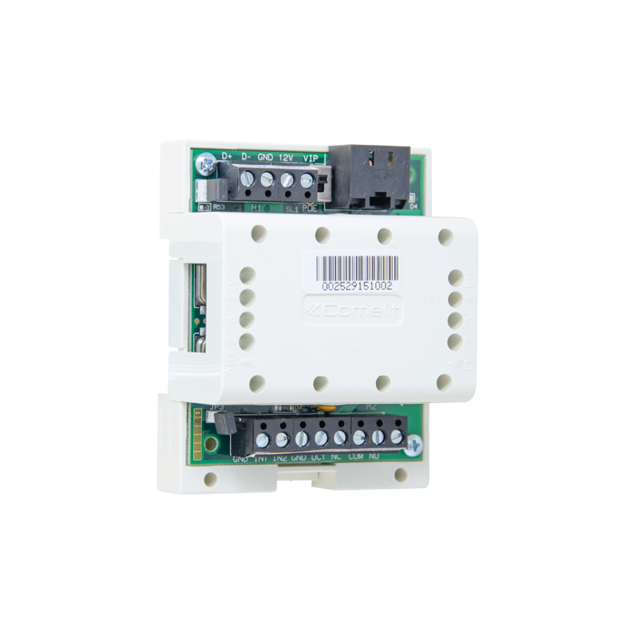 Beveiligingsinrichting voor het ViP-systeem. Als de inrichting in het systeem is aangebracht, moeten er gebruikersgegevens worden ingevoerd voordat de configuratiesoftware van ViP- manager kan worden gebruikt. Volg voor het gebruik en de programmering de aanwijzingen in de technische documentatie. RJ 45-connector. Afmetingen: 66x85x35 mm (4 DIN-modules).