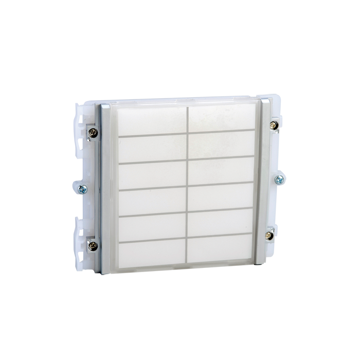 Module met LED-verlichting voor diverse functies. Verlichting naamkaders instelbaar op blauw, wit of uit. Bevat kaart waarop de namen en codes van maximaal 12 bewoners kunnen worden geschreven. Afmetingen: 112 x 89,5 x 39 mm.