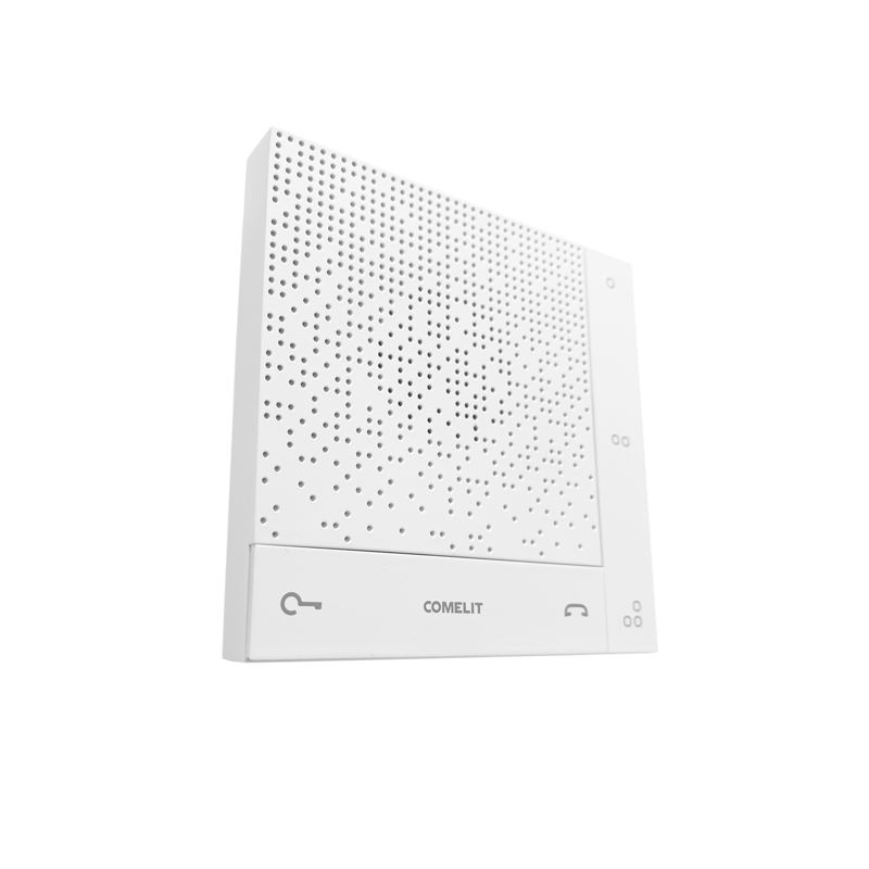 Design deurtelefoon voor VIP-systeem, handsfree, met elektronisch oproepsignaal. Met 5 drukknoppen aan de voorkant, waarvan er 2 symbolen met achtergrondverlichting hebben die de in de fabriek ingestelde functie (deurslotbediening en beheer oproepen) identificeren en 3 programmeerbare drukknoppen. De drukknoppen zijn uitgerust met tactiele geleiders voor blinden. Aan de linkerkant van de deurtelefoon bevinden zich 2 schakelaars: de eerste om het beltoonvolume of de stille modus (met signaleringsled) in te stellen, de tweede om het audiovolume te regelen. Maakt de modi "automatische deurslotbediening bij oproep (arts)", "Automatisch antwoord (handsfree)", meeluisterbeveiliging en etagebelbeheer mogelijk. Afmetingen (B x H x D): 121 x 121 x 25 mm.