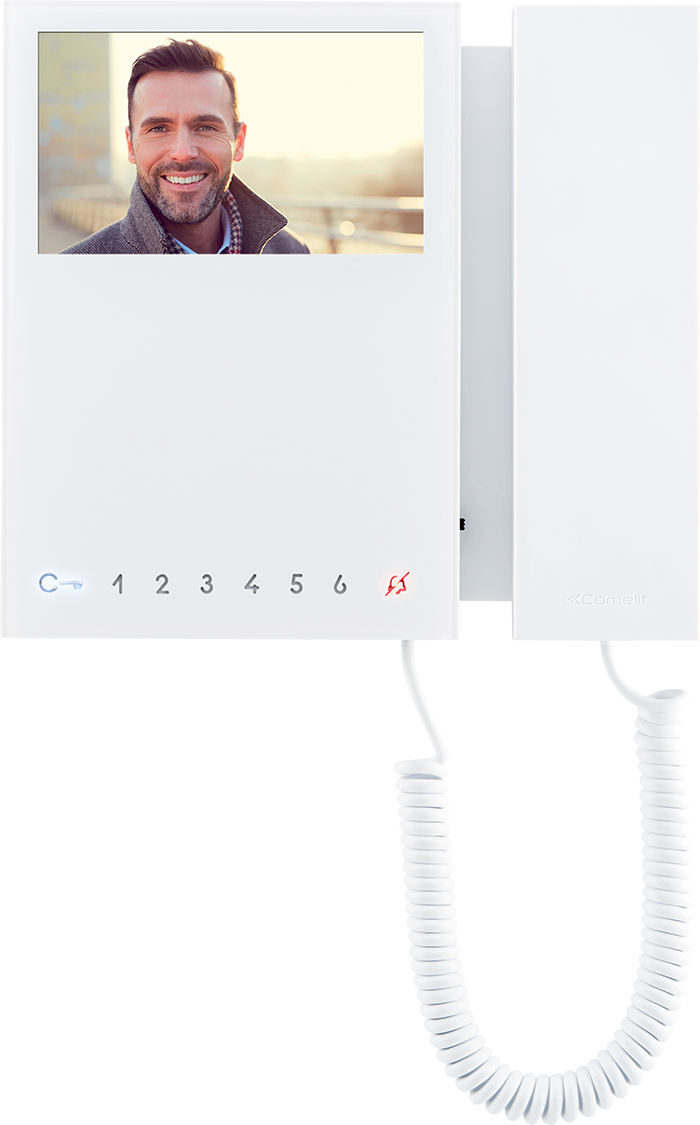Opbouwmonitor met 4,3''/ 16:9 kleurenscherm en hoorn. Hiermee kunnen de helderheid en de kleur worden geregeld en kan het gewenste oproeptoonvolume worden ingesteld. Standaard voorzien van 8 soft-touch toetsen voor deurslotbediening, beeldoproep, oproep naar centrale, relaissturing, privacy-functie en van signaleringsled voor de deurstatus. Biedt standaard de mogelijkheid voor een etagebel aansluiting. Compleet met 2 dipswitches met 8 standen voor het instellen van de gebruikerscode en het programmeren van de drukknoppen. Inclusief muurplaat voor wandbevestiging of aansluiting op een inbouwdoos en een aftakblokje voor stamleiding art 1214/2C. De monitor kan alleen worden gebruikt voor 2-draads systemen Simplebus2. Afmetingen (B x H x D): 175x160x22mm.