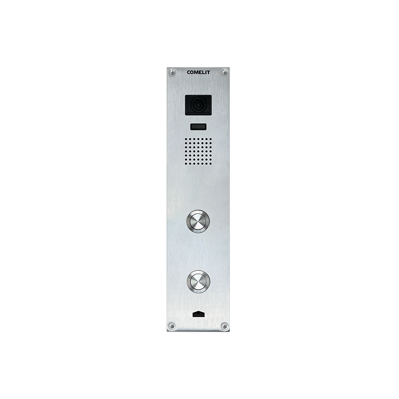 Monobloc inbouw audio/video-deurstation met 2 drukknoppen Adam. Digitaal 2-draads systeem Simplebus 2. Het frontpaneel is uitgevoerd in geanodiseerd aluminium, bestand tegen weersinvloeden en vandalismebestendig (beschermingsgraad IK08) Groothoekcamera. De drukknoppen zijn al voorgeprogrammeerd om de video-deurintercoms op te roepen met oproepcode 1 en 2. De totale breedte bedraagt slechts 60 mm, een zeer beperkte afmeting waardoor het deurstation naast de traditionele wandmontage ook direct op de deurstijl kan worden geïnstalleerd. Ook ideaal voor renovaties. Het is mogelijk naamkaders, art. AD9201, toe te voegen en door de gebruiker aan te passen informatieplaatjes, art. AD9202. Afmetingen (B x H x D): 60 x 250 x 37mm.
