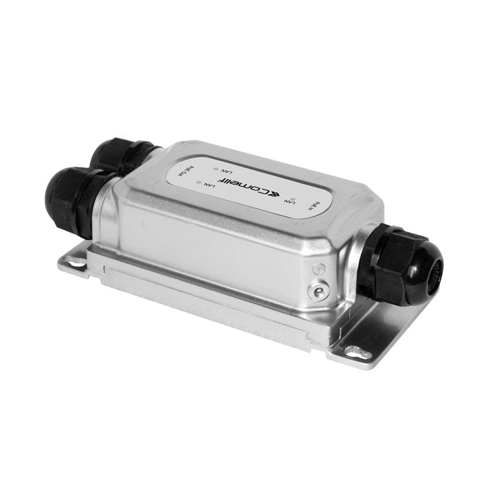 PoE repeater 10/100/1000Mbps, standaard IEEE802.3af/at/bt. 1 RJ45 ingang 95W max, twee RJ45 uitgangen 30W elk, bereik tot 100m. Plug-and-play bediening en bedieningsindicator. Bedrijfstemperatuur van -20°C tot 60°C, waterproof IP67, vandalproof IK10.