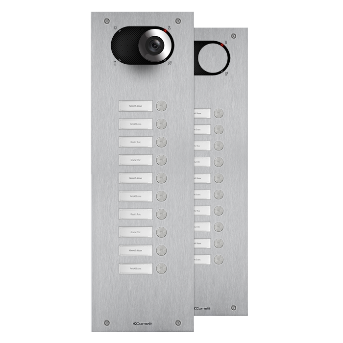 Frontpaneel voor deurstation Switch in 2,5 mm dik roestvast geborsteld staal AISI 316. Dankzij de meegeleverde adapter art. 1250U is het mogelijk de afzonderlijk verkrijgbare audio- of audio/videomodule te gebruiken, afhankelijk van het type bedrading (digitale 2-draads Simplebus of ViP). Compleet met 10 reeds gemonteerde en bedrade drukknoppen. Naamkaders met witte led-achtergrondverlichting. Vervanging van de naamkaders direct vanaf de voorzijde. Beschermingsklasse IK08. Uit te breiden met inbouwdoos of opbouwbehuizing (afzonderlijk verkocht). Afmetingen (L x H x D): 150 x 475,5 x 2,5mm.