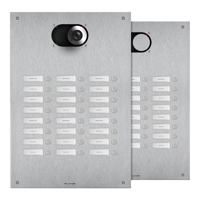 Frontpaneel voor deurstation Switch in 2,5 mm dik roestvast geborsteld staal AISI 316. Dankzij de meegeleverde adapter art. 1250U is het mogelijk de afzonderlijk verkrijgbare audio- of audio/videomodule te gebruiken, afhankelijk van het type bedrading (digitale 2-draads Simplebus of ViP). Compleet met 24 drukknoppen aangebracht over 3 rijen die al gemonteerd en bedraad zijn. Naamkaders met witte led-achtergrondverlichting. Vervanging van de naamkaders direct vanaf de voorzijde. Beschermingsklasse IK08. Uit te breiden met inbouwdoos of opbouwbehuizing (afzonderlijk verkocht). Afmetingen (L x H x D): 302,9 x 448,9 x 2,5mm.