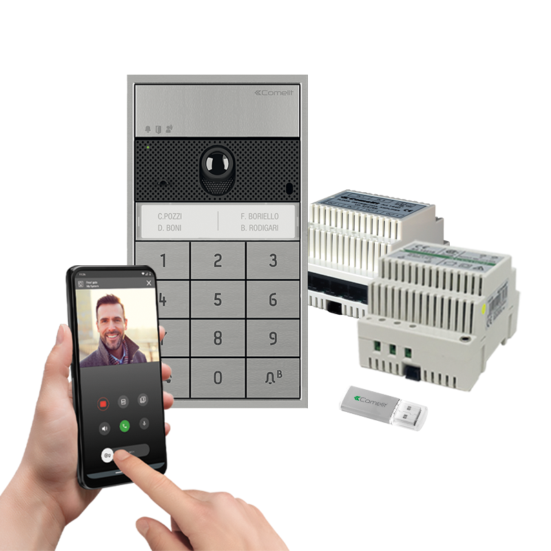 Enkelvoudige kit met audio-/videodeurstation ULTRA en numeriek keypad, multi-user gateway en een master-licentie voor ViP-systeem. Geschikt voor installatie in woningen, commerciële omgevingen of kantoren. De kit kan worden uitgebreid met andere producten uit de ViP- catalogus. In combinatie met de Comelit-app, die gratis kan worden gedownload via de Google en Apple store, is het mogelijk om oproepen zowel lokaal als op afstand direct via smartphone/tablet te beantwoorden en de virtuele sleutels in numeriek formaat of als QR-code te delen voor activering van het deurslot. De kit bevat: 1 art. UT8020 - audio/videomodule Ultra IP, 1 art. UT9172 - opbouwbehuizing 2 modules ultra1 art. UT9279M - numeriek toetsenbordmodule Ultra, 1 art. 1456B - multi-user gateway voor ViP-systeem, 1 art. 1456B/M1 - enkele master-licentie voor 1456B op USB-stick, 1 art. 1441B - voedingseenheid 30W.