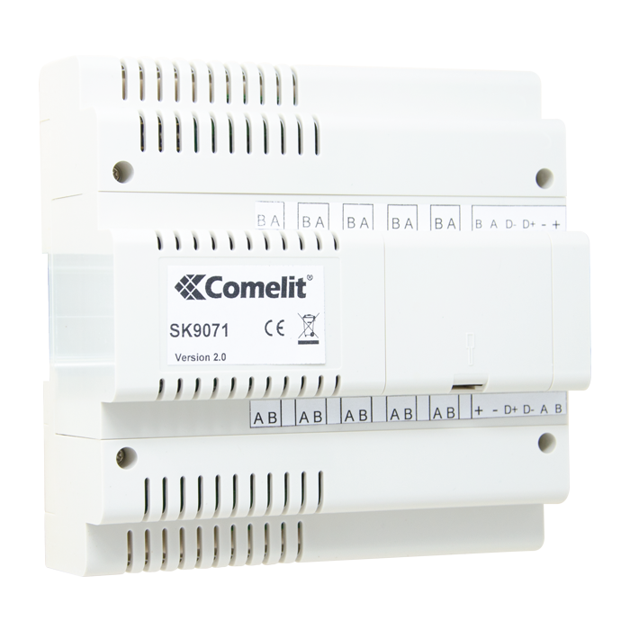Aan te sluiten op de ViP-relaissturingsmodule code 1443. 12 Vdc voeding. Maak het mogelijk om een of meer relaiscontacten te activeren voor interface met liftsystemen of andere activeringen: er kunnen maximaal 10 stuks SK9071 worden aangesloten, dus tot 100 relaiscontacten (verdiepingen). Pvc behuizing DIN-staaf. Afmetingen 140x95x55 mm (8 DIN- modules)