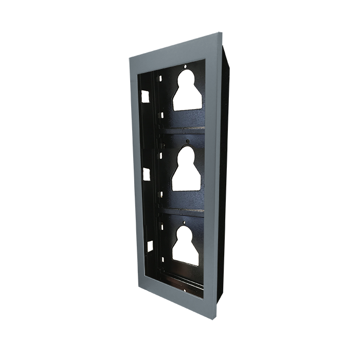 Inbouwframe 3 modules voor deurstation Ultra. Bestaat uit een metalen wandsteun waarmee de modules zonder schroeven stevig kunnen worden bevestigd en uit een afdekframe uitgevoerd in gegoten aluminium voorzien van KTL-behandeling om de weerstand tegen chemische en omgevingscorrosie te verhogen, inclusief UV-straling. Steekt 10 mm uit de wand. Te gebruiken op inbouwdozen art. 3110/3 en 3110/3A met de mogelijkheid om horizontaal meerdere modules naast elkaar te plaatsen. Afmetingen: 125,5x317,5x35mm