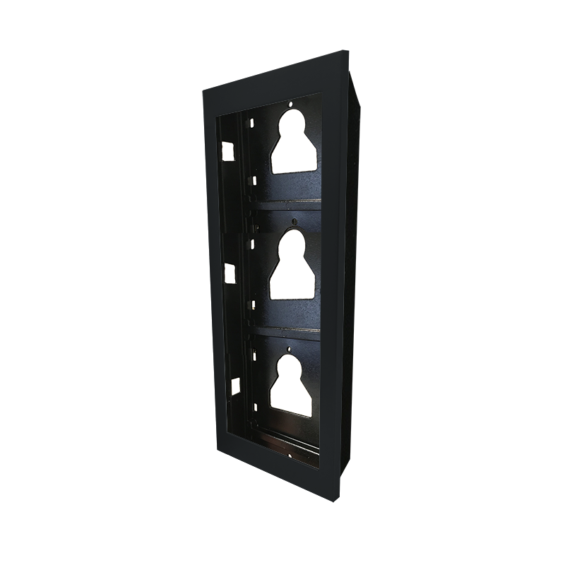 Inbouwframe 3 modules voor deurstation Ultra, kleur zwart RAL9005. Bestaat uit een metalen wandsteun waarmee de modules zonder schroeven stevig kunnen worden bevestigd en uit een afdekframe uitgevoerd in gegoten aluminium voorzien van KTL-coating om de weerstand tegen chemische en omgevingscorrosie te verhogen, inclusief UV-straling. Steekt 10 mm uit de wand. Te gebruiken op inbouwdozen art. 3110/3 en 3110/3A met de mogelijkheid om meerdere modules horizontaal naast elkaar te plaatsen. Afmetingen (B x H x D): 125,5 x 317,5 x 35mm.