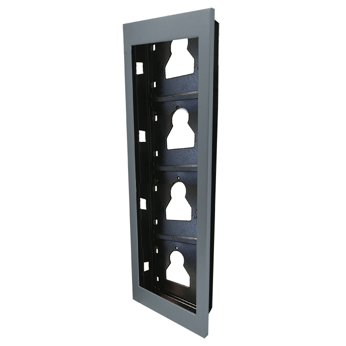 Inbouwframe 4 modules voor deurstation Ultra. Bestaat uit een metalen wandsteun waarmee de modules zonder schroeven stevig kunnen worden bevestigd en uit een afdekframe uitgevoerd in gegoten aluminium voorzien van KTL-behandeling om de weerstand tegen chemische en omgevingscorrosie te verhogen, inclusief UV-straling. Steekt 10 mm uit de wand. Te gebruiken op inbouwdozen art. 3110/4 en 3110/4A met de mogelijkheid om horizontaal meerdere modules naast elkaar te plaatsen. Afmetingen: 125,5x408x35mm