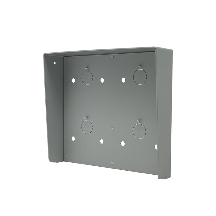 Regenkap voor opbouwbehuizing 4 modules (2 wandsteunen met 2 naast elkaar geplaatste modules) voor deurstation Ultra. Van grijsgekleurd, geanodiseerd aluminium. Afmetingen (B x H x D): 221x198x57mm.