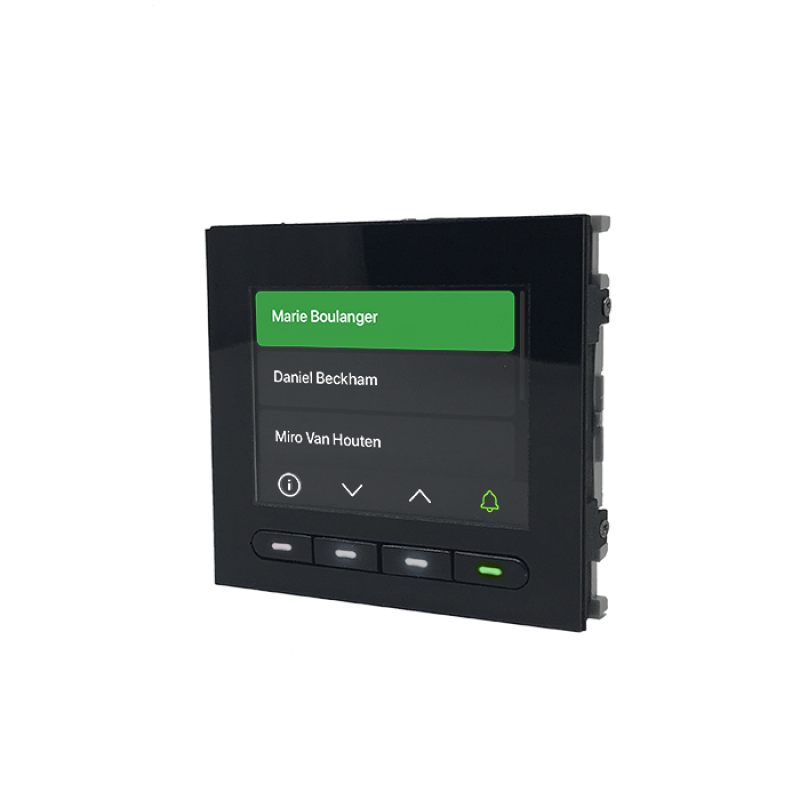 Een van de drukknoppen kan worden aangepast voor directe oproepen naar de centrale, commerciële activiteiten of het activeren van functies zoals verlichting of een opening. De module is voorzien van een helder 3,5" grafisch kleurendisplay voor een overzichtelijke gebruikersinterface.