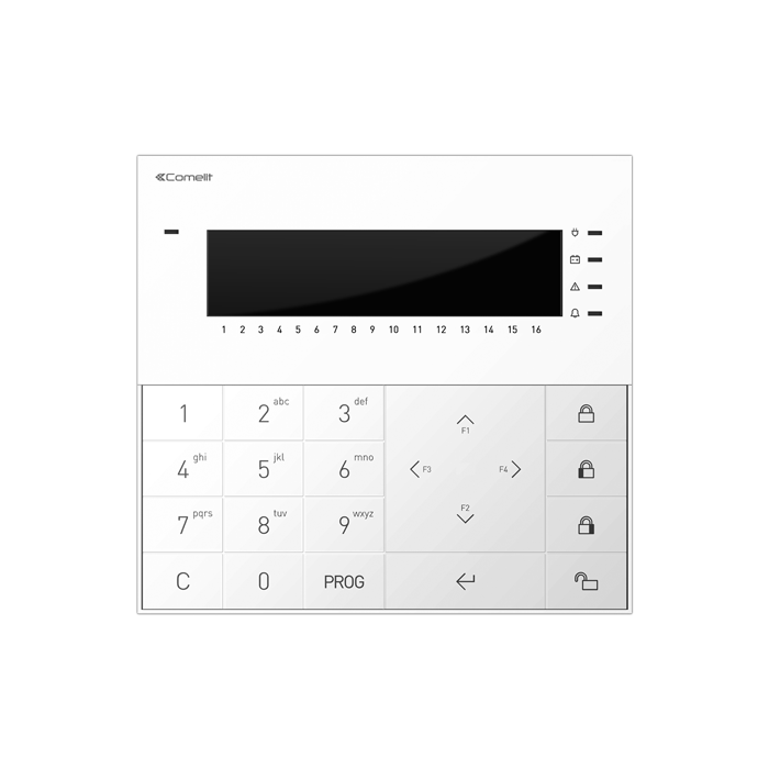 Soft-touch keypad met alfanumeriek lcd-scherm voor het beheer en de programmering van Vedo alarmcentrales. Voorzien van 4 signaleringsleds (aanwezigheid netvoeding, batterij leeg, afwijking en alarm), 2 ingangen die vrij kunnen worden geprogrammeerd als NC, NO, single, double of triple gebalanceerd of double-zone, 4 configureerbare functietoetsen, tamperbeveiliging tegen manipulatie en lostrekken. Een ingebouwde lichtsensor zorgt voor de optimale instelling van de achtergrondverlichting van het keypad. Het apparaat is bovendien uitgerust met een zoemer voor de geluidssignalering van de verschillende opdrachten. Screenprints vanuit 16 zones. Afm. 137 x 127 x 24 mm.